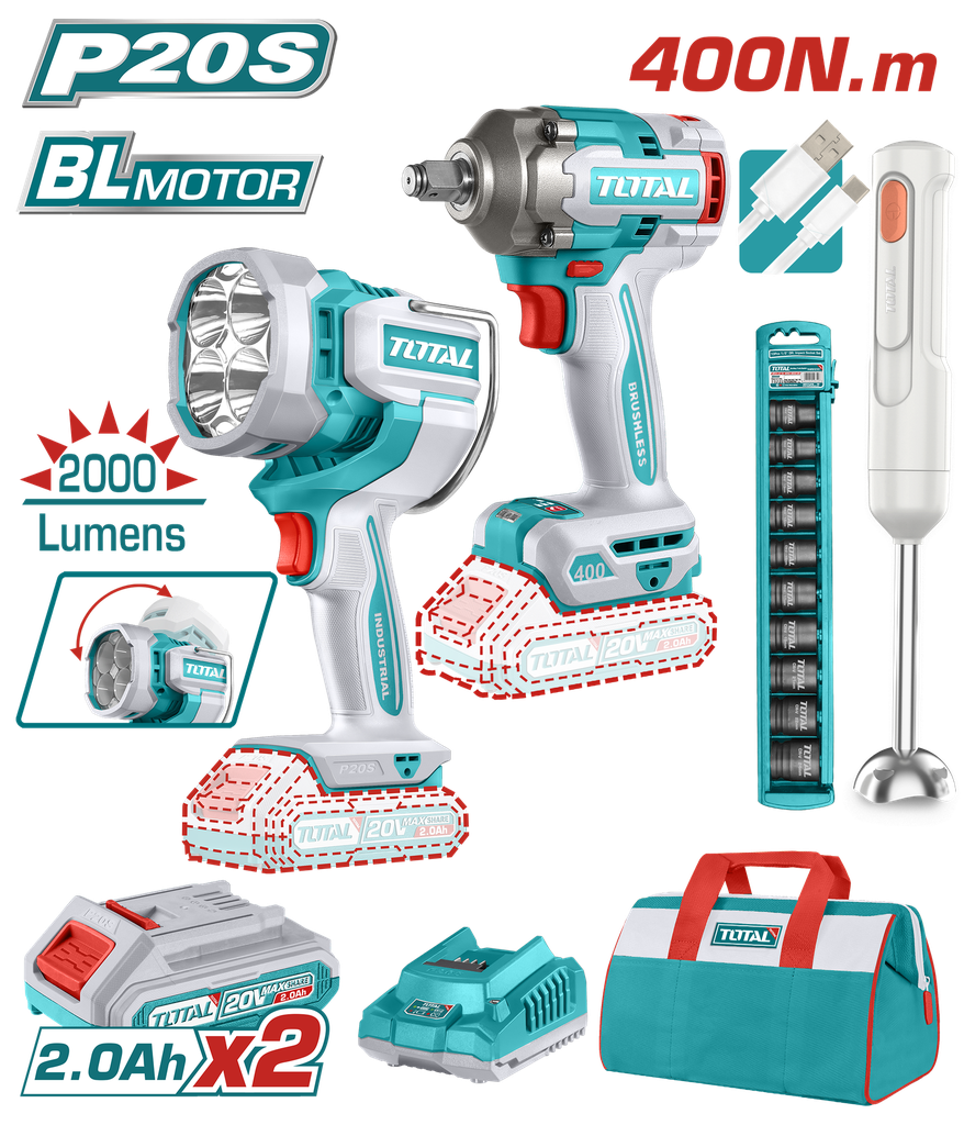 COMBO INALAMBRICO 20V PISTOLA IMPACTO INALAMBRICA 1/2 400NM + LAMPARA DE TRABAJO INALAMBRICA 2000 LUMENES + BATIDORA RECARGABLE INCLUYE 2 BATERIAS 2.0 AH, CARGADOR Y COPAS INDUSTRIAL SUPER TOTAL ( UTOSLI240961)