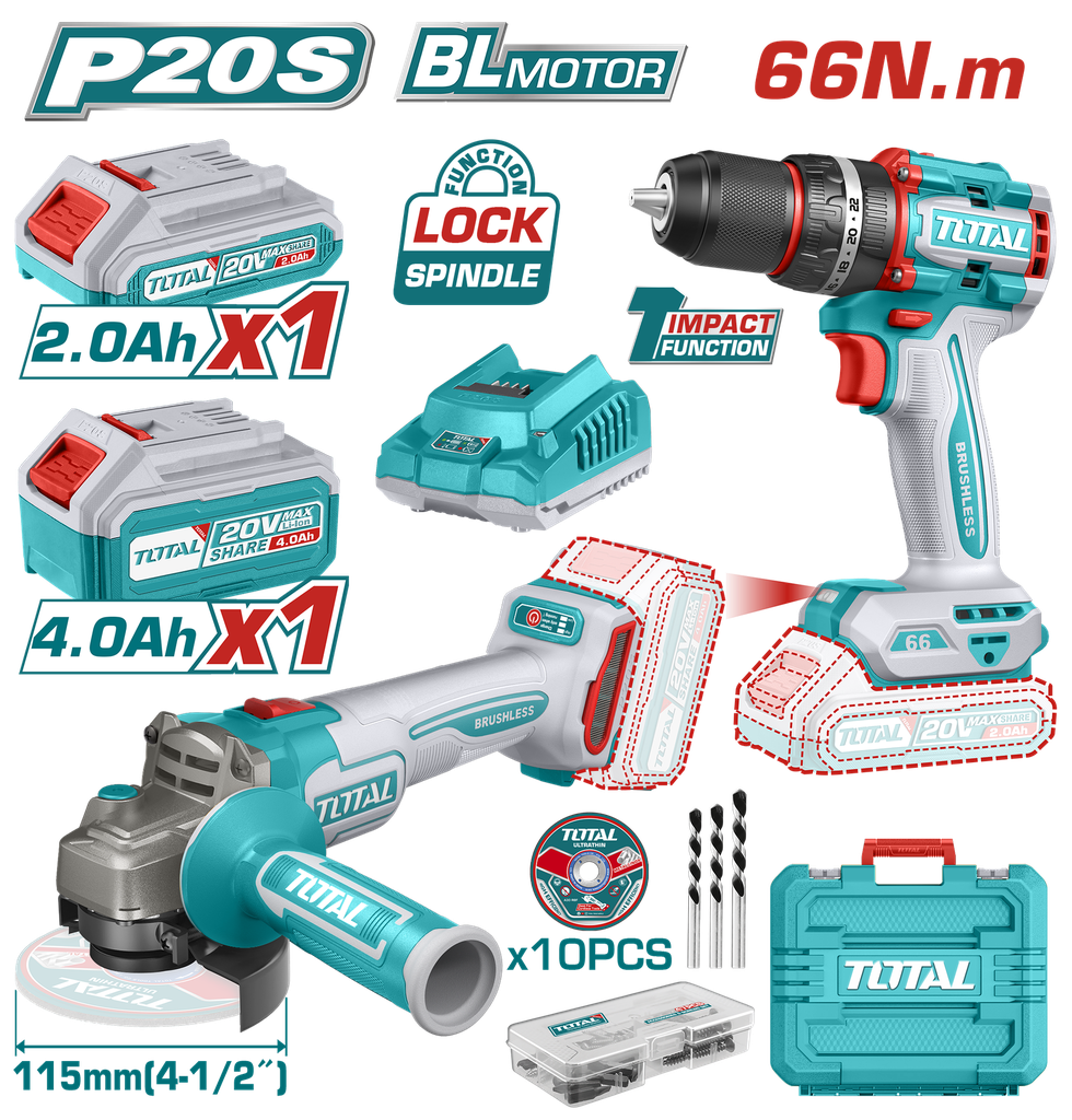 COMBO INALAMBRICO TALADRO 1/2″ 20V 66NM + PULIDORA 4 1/2″ INCLUYE 1 BATERIA 20V(2.0AH), 1 BATERIA 20V(4.0AH),CARGADOR 20V, 10 DISCOS DE CORTE Y ACCESORIOS TOTAL (UTCKLI20273)
