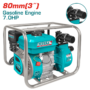 MOTOBOMBA A GASOLINA 7.0HP, SALIDA 80MM(3″) FLUJO MAX 1000L/MIN, MAXIMO ELEVACION 32M , MAXIMO DE SUCCION 8M, DESPLAZAMIENTO 208CC CAPACIDAD TANQUE 3.6L INDUSTRIAL SUPER TOTAL (TP3302)